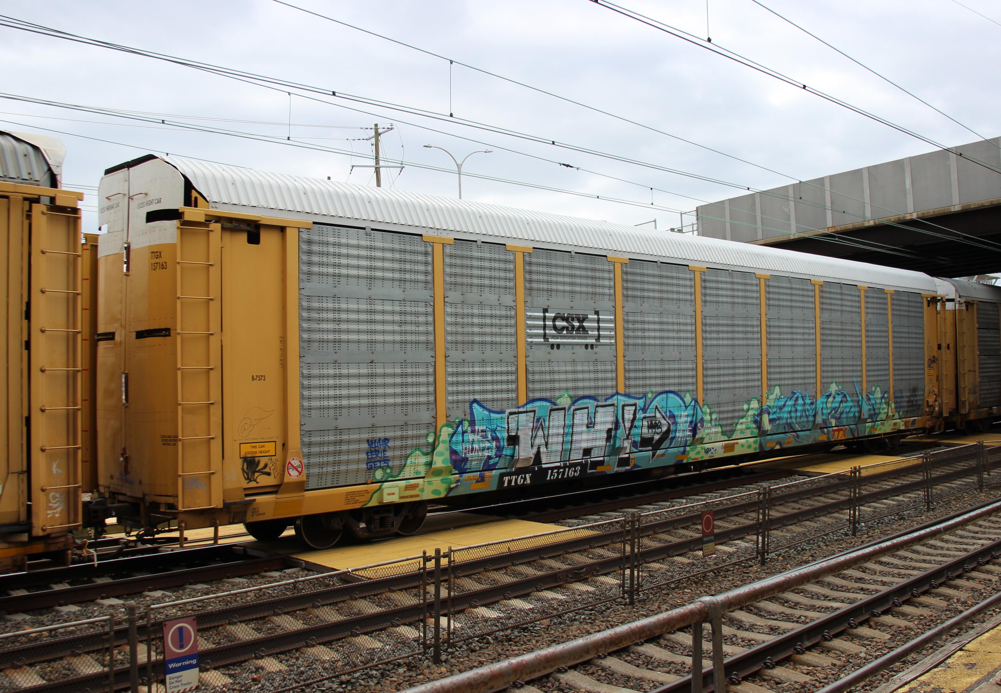 TTGX 157163 is seen in the consist of NS 36A at Newark, DE on 3/6/21.Rack was built as CR 7573, a CR ML2Kclass rack, in 6-89. It was then rebuilt repainted and renumbered to CSX B-7573 in 3-17.