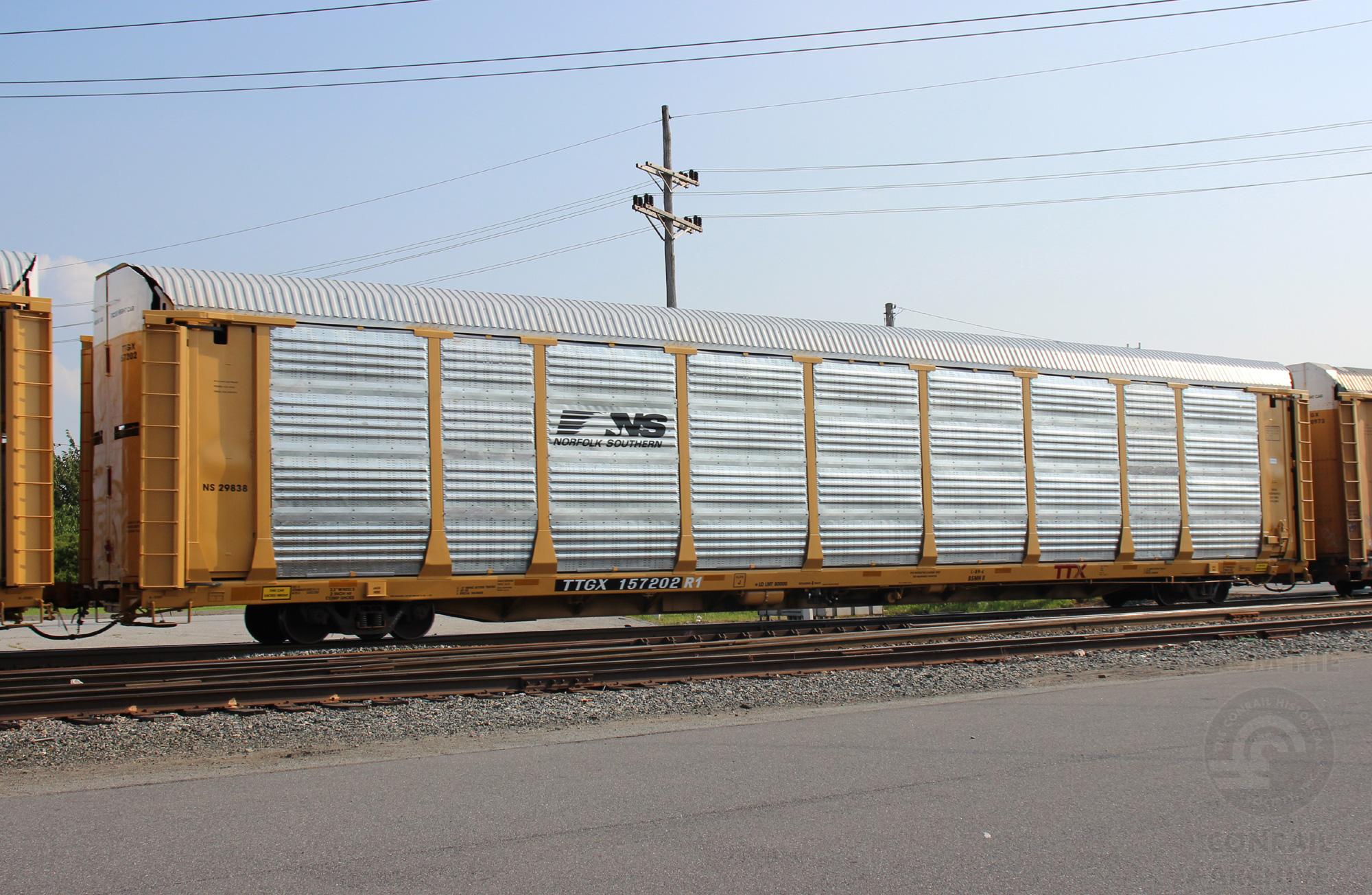 TTGX 157202 is seen in the consist of CSX Q216-19 at Elsmere, DE on 7/20/19. Rack was built as CR 8482, a CR ML2L class rack, in 6-90. It was then rebuilt, repainted and renumbered to NS 29838 in 6-19 by TrinityRail as part of Job C1009. Rack does not have a new NS class stenciled on it. Photo by Chris Carangi.