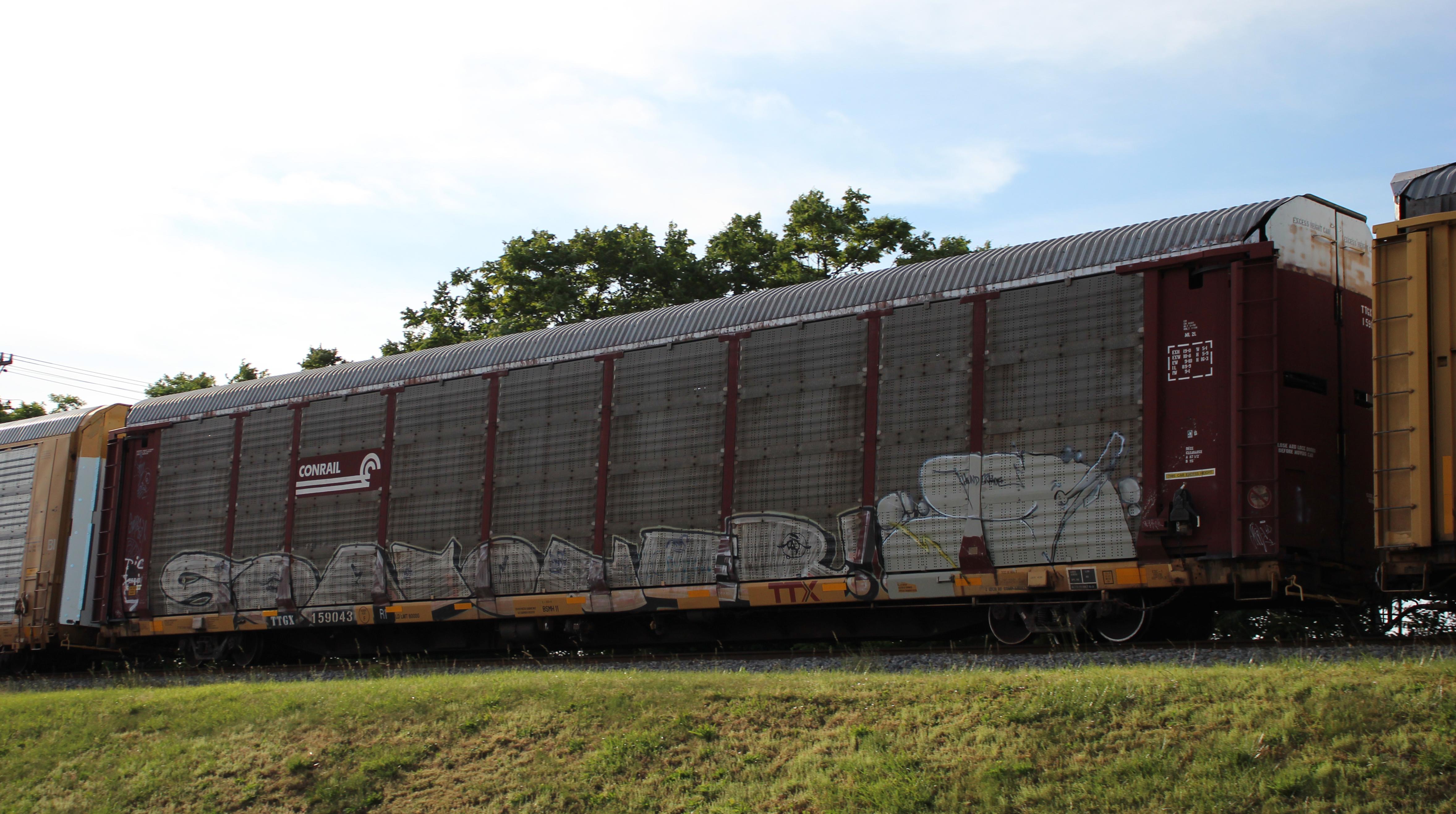 TTGX 159043is seen in the consist of CSX M216-25 at Newark, DE on 5/27/23. Rack number is CR 8481, built 6-90, rebuilt 1-98 and is now owned by NS.