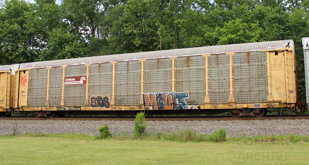 TTGX 159088 is seen in the consist of CSX Q276-14 at Corriganville, MD on 6/15/16. Rack number is CR 8265, built 5-90, rebuilt 1-99 and is now owned by CSX.
