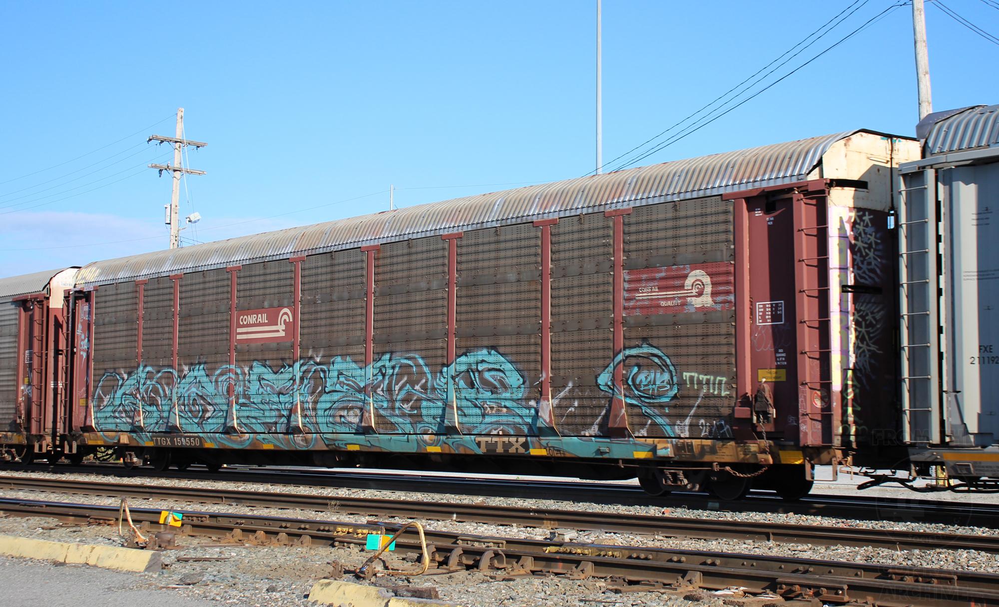 TTGX 159550is seen in the consist of CSX Q216-06at Elsmere, DE on 5/9/22. Rack number is CR 7695, built 2-89, rebuilt 4-97 and is now owned by NS.