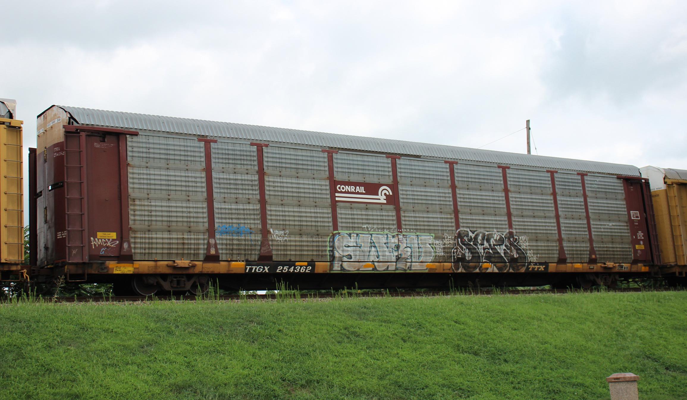 TTGX 254362 is seen in the consist of CSX Q216-30 at Newark, DE on 8/2/20. Rack number is CR 10864, built 9-97 and is now owned by CSX. Photo by Chris Carangi.