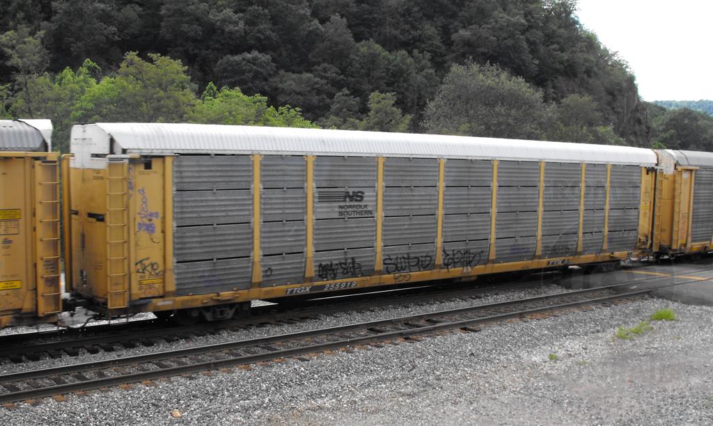 TTGX 255919 is seen in NS paint on Q276-10 at Fairhope PA on 8/11/12. Rack was built as a unknown ML2F in 7-86 and rebuilt, repainted and renumbered to NS 27060 in 3-05. Rack now carries NS rack class FB543.