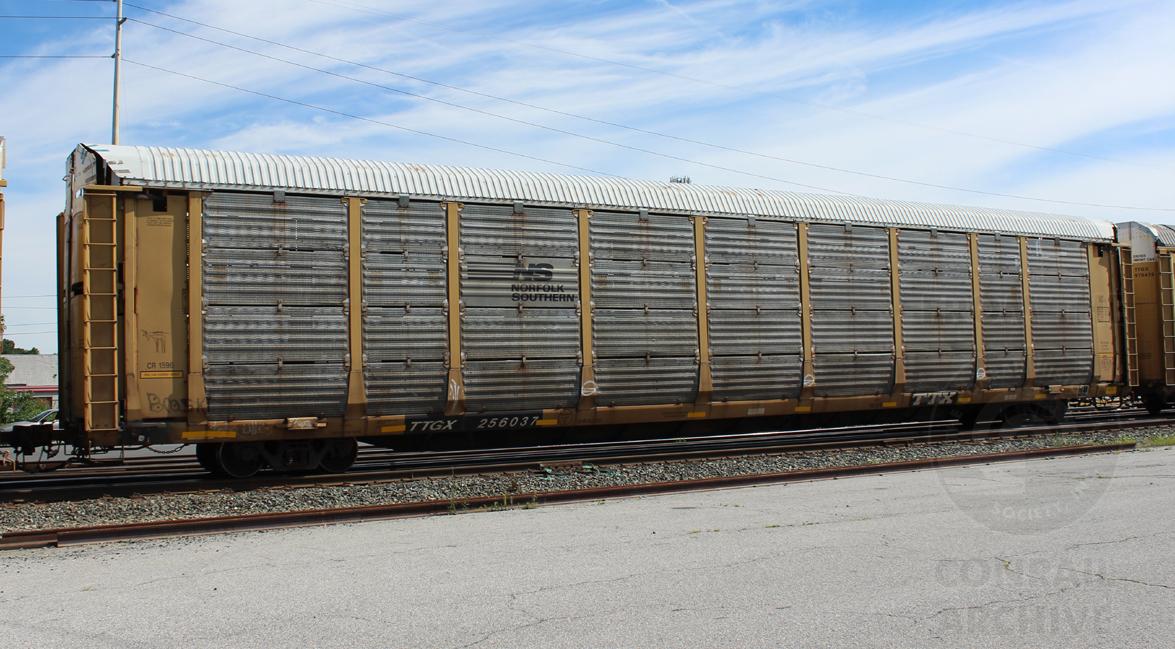 TTGX 256037 is seen in the consist of CSX Q295-02 at Elsmere, DE on 7/2/16. Rack number is CR 1596, built 12-85 and was rebuilt and repainted NS in 2-03. Rack is now classed FB541 by NS, but is also still stenciled ML2D.