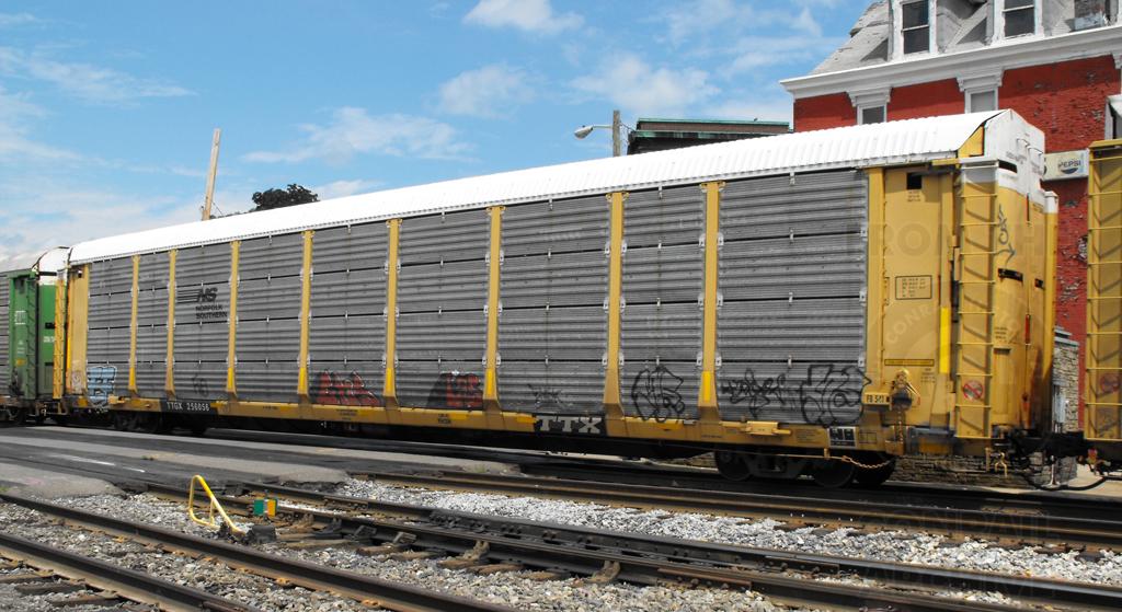 TTGX 256056 is seen in NS paint on Q261-09 at Cumberland MD on 8/10/12. Rack was built as a unknown ML2D class rack in 12-85 and rebuilt, repainted, and renumbered to NS 27035 in 11-05. Rack now carries NS rack class of FB541.