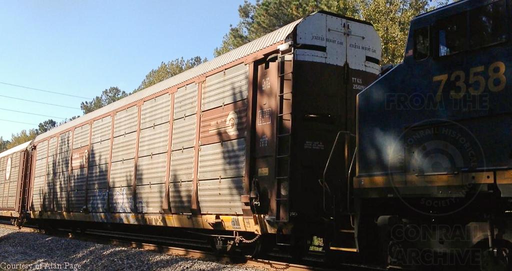 CSXT CW44AC 451 and C40-8W 7358 (CR 6193) pound a line of autoracks, including TTGX 256195 (CR 1656 ML2C rack Blt 6-75 Rblt 7-95), northbound at Tyrone, GA on October 2, 2014.