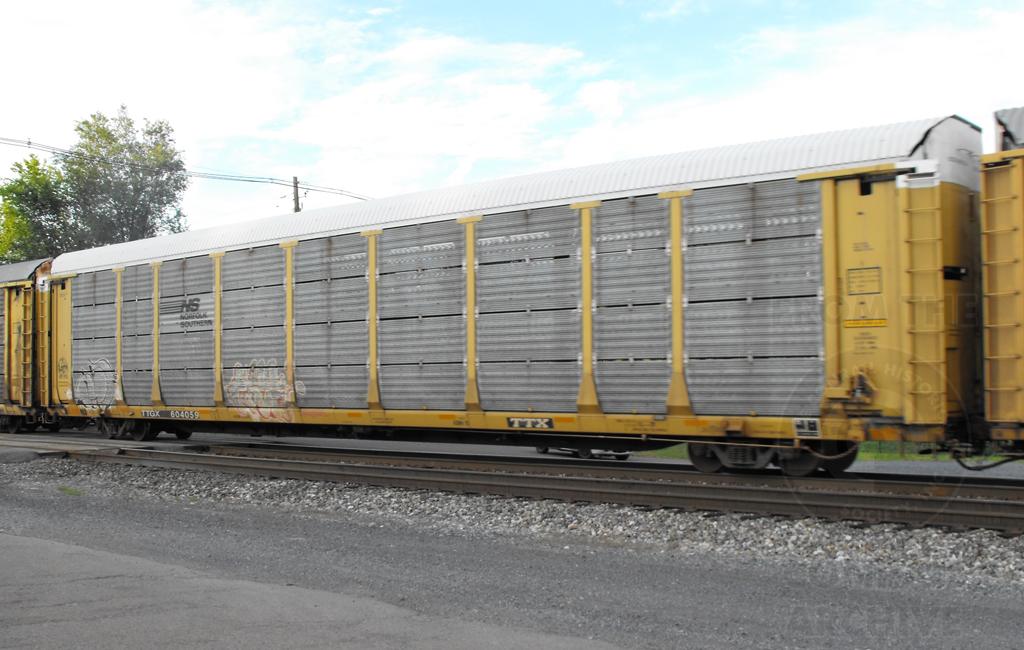 TTGX 604059 is seen in NS paint on Q217-11 at Hyndman PA on 8/11/12. Rack is ex CR 8299, a ML2L class rack and now carries a unknown NS rack number. Rack now carries NS rack class of FB548.
