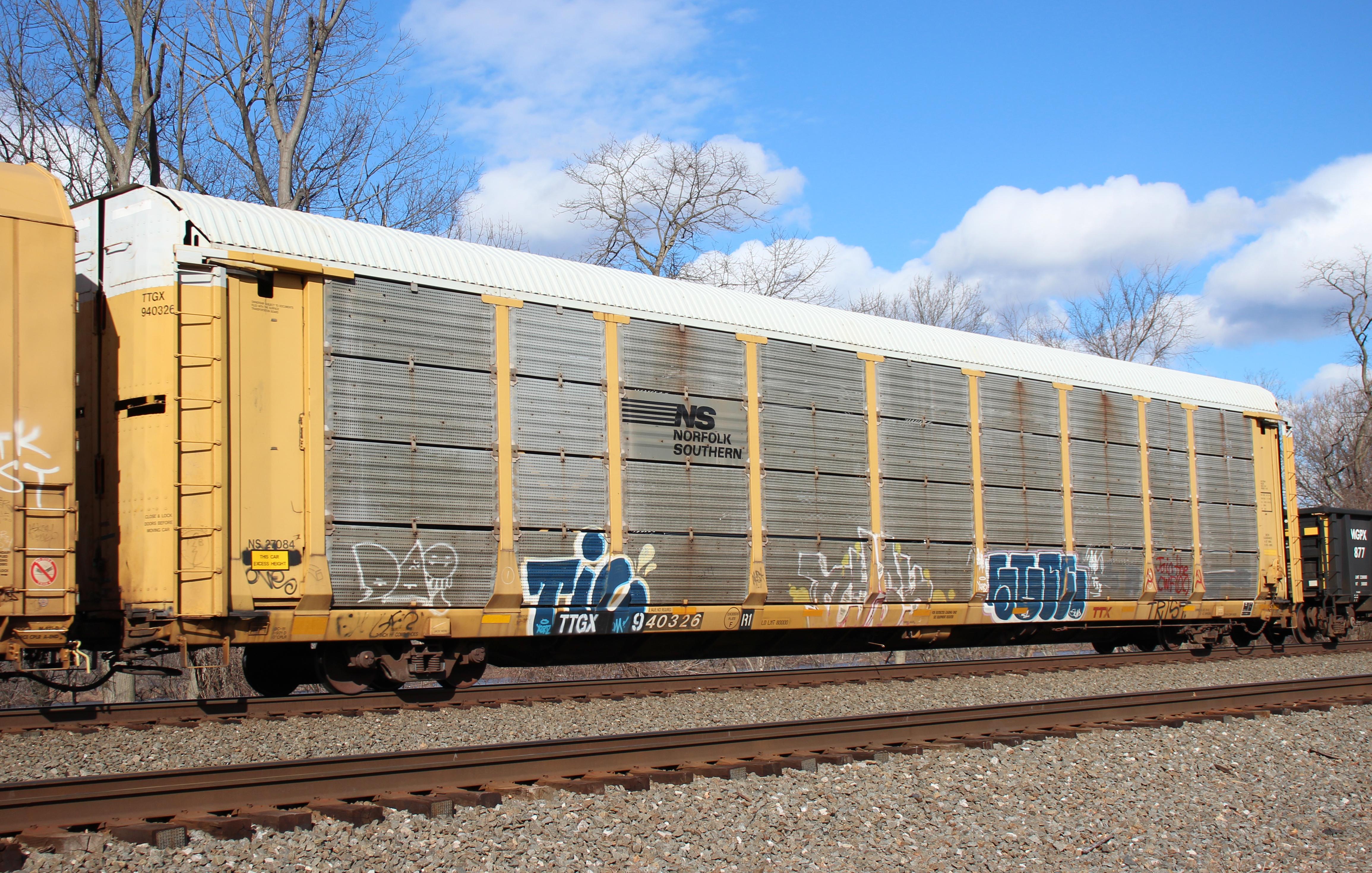TTGX 940326 is seen in the consist of NS 36A at Cove, PA on 3/11/25. Rack was built as an unknown ML2M class rack in 4-91. It was then rebuilt, repainted and renumbered to NS 27084 in 7-05. Rack is now classed FB549 by NS but is also stenciled ML2M.
