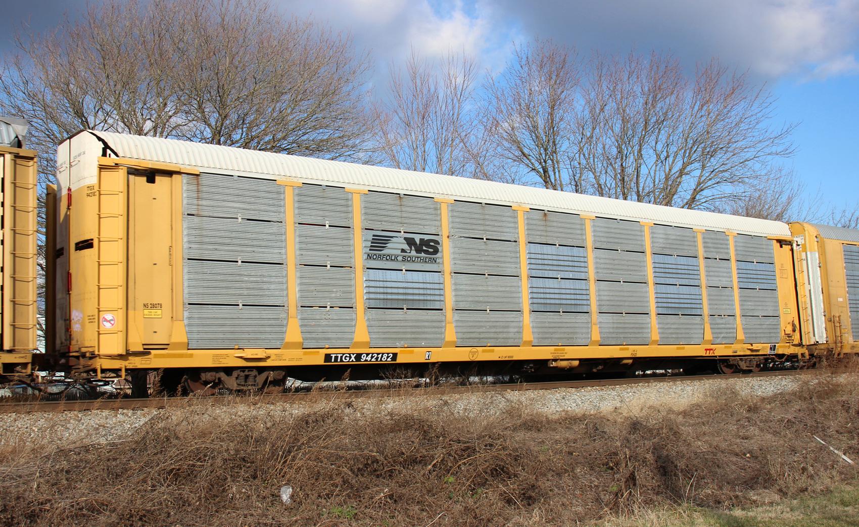 TTGX 942182 is seen in the consist of CSX Q216-17 at Newark, DE on 1/19/20. Rack was built as CR 9494, a CR ML2L class rack, in 2-93, then was rebuilt, repainted and renumbered to NS 28078 in 5-15 by MEI ESTL. Rack is now classed FB552 by NS.
