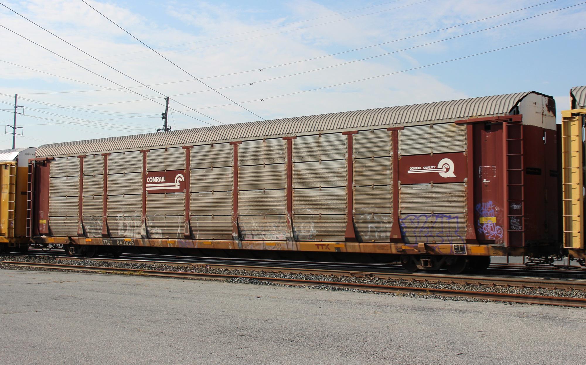 TTGX 942825 is seen in the consist of CSX Q216-28 at Elsmere, DE on 9/28/19. Rack number is CR 9436, built 2-93 and is now owned by CSX.