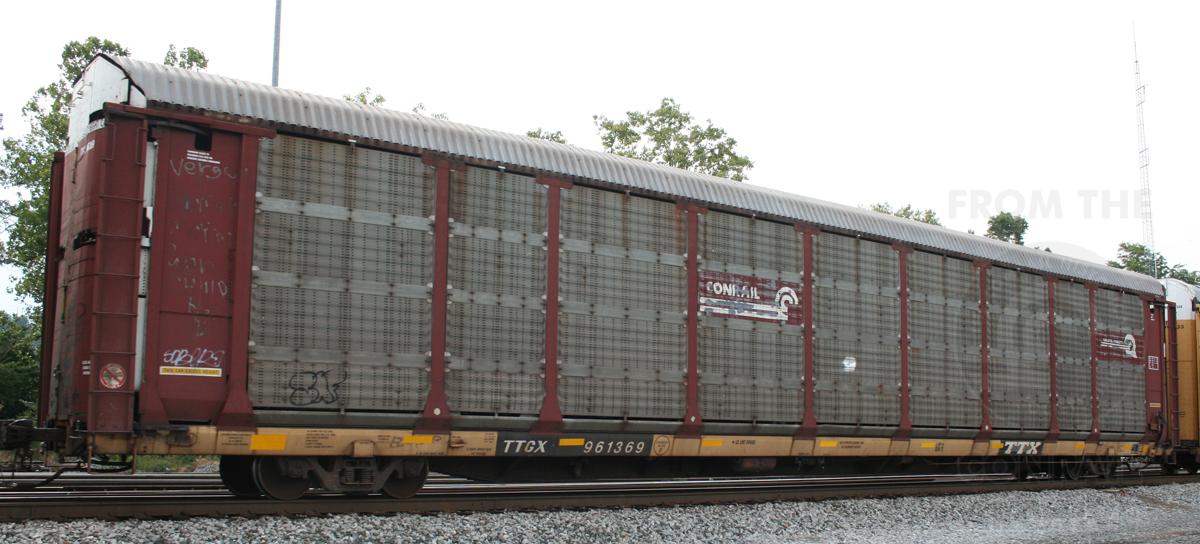 Previous Next Rack number is CR 1756; rebuilt 7-97. Photo By Donnie Lee Location Details Virginia Ave Equipment Type TTGX Bi-Levels Year 2012 Original Date 9/1/12 Collection CRHS Conrail Photo Archive Contributions