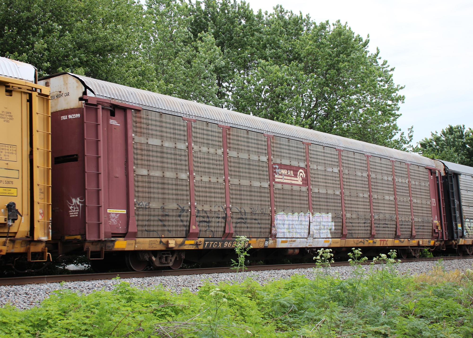 TTGX 962599 is seen in the consist of CSX Q216-10 at Newark, DE on 6/13/21. Rack number is CR 8071, built 4-90, rebuilt 12-97 and is now owned by CSX.