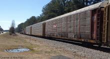 CSX SD40-2 8060, SD50-2 8666, and UP ES44AC 7413 pull a load of autoracks, including TTGX bi-level 963691 (CR ML2G rack 6717), through Peachtree City, GA in March 2014.