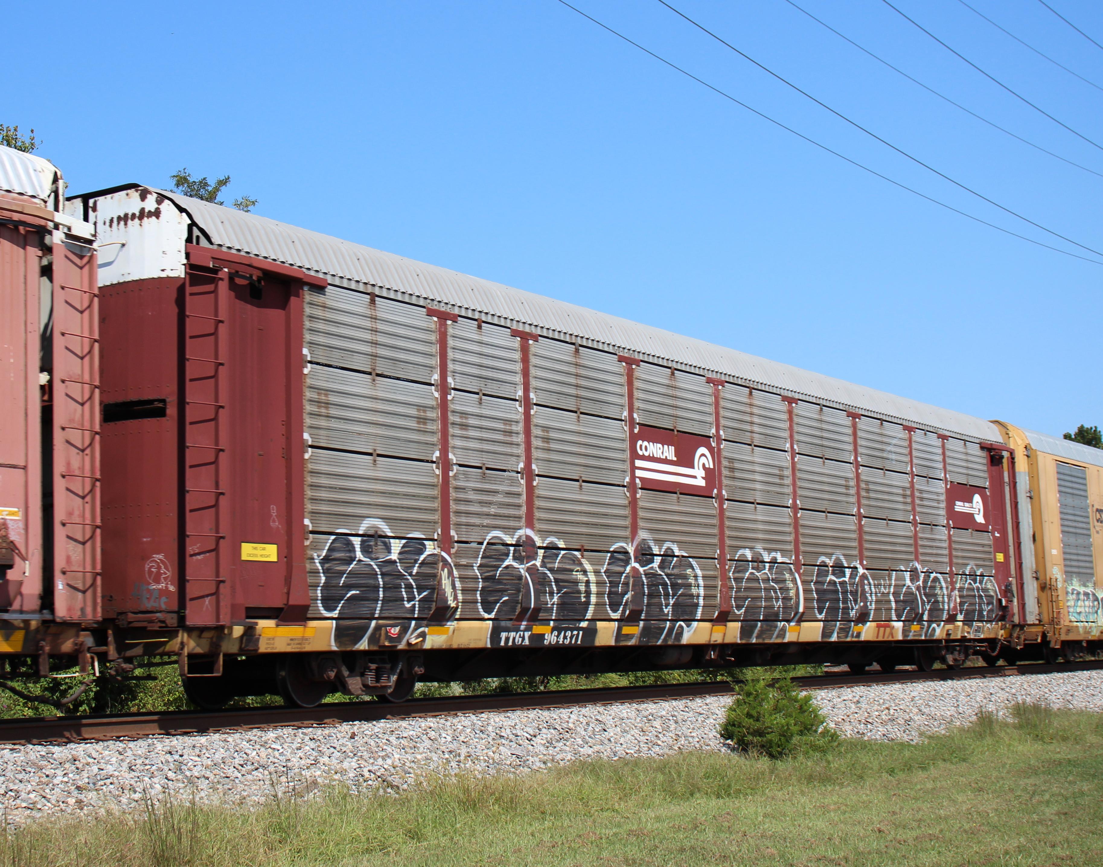 TTGX 964371is seen in the consist of CSX M217-14 at Stanton, DE on 9/14/24. Racknumber is CR 9661, built 3-93 and is now owned by NS.