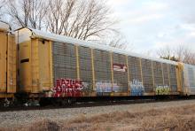 TTGX 964432 is seen in the consist of CSX Q216-17 at Newark, DE on 3/20/22. Rack number is CR 8438, built 6-90, rebuilt 3-98 and is now owned by NS.