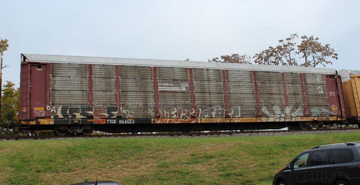 TTGX 964553 is seen in the consist of CSX L217-01 at Newark, DE on 11/1/15. Rack number is CR 6799, built 10-88 and is now owned by NS.