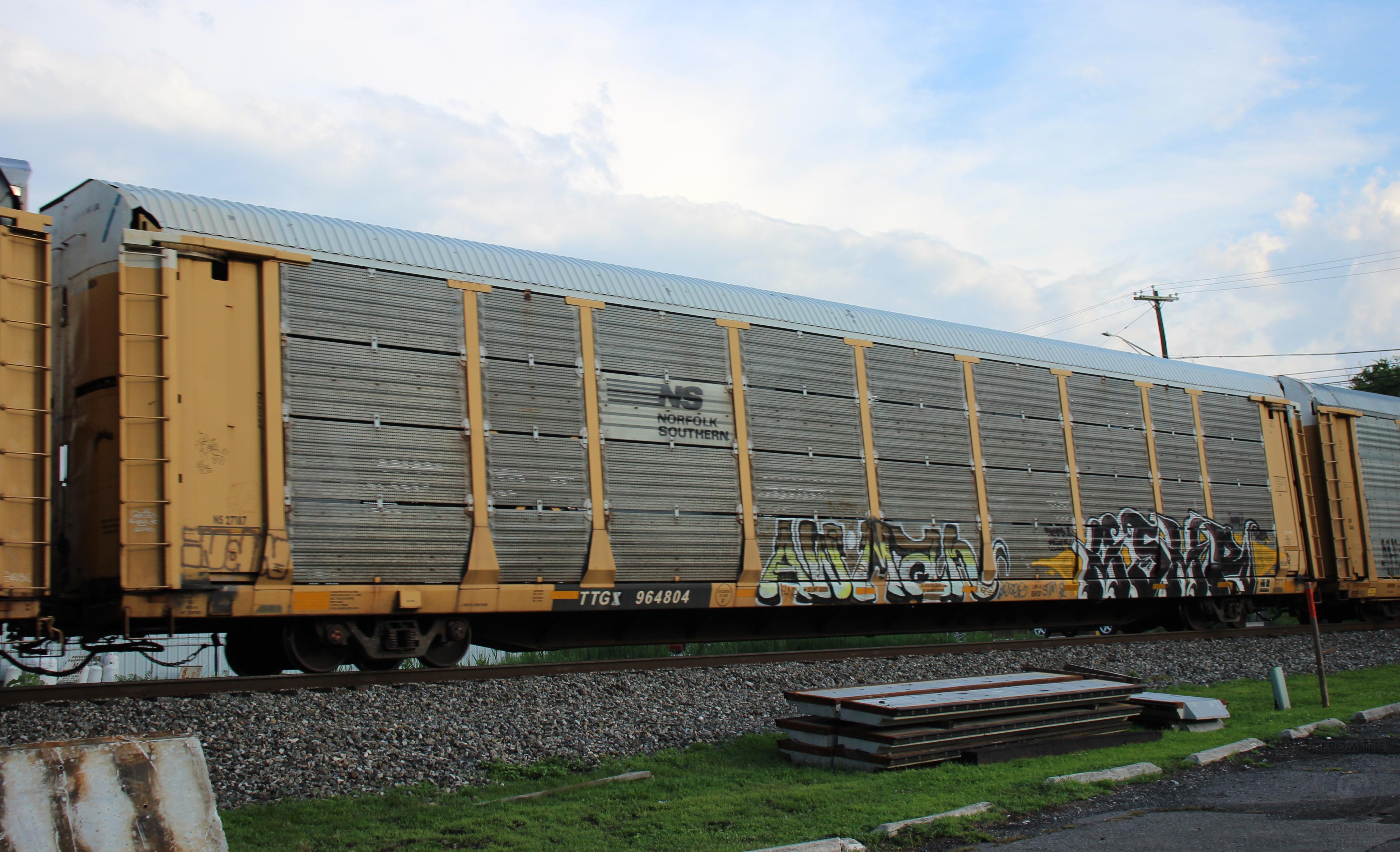 TTGX 964804 is seen in the consist of CSX Q216-30at Boothwyn, PAon 7/2/21. Rack was built as a unknown CR ML2L class rack in 1-92. It was then rebuilt repainted and renumbered to NS 27187 in 5-05. Rack is now classed FB550 by NS.