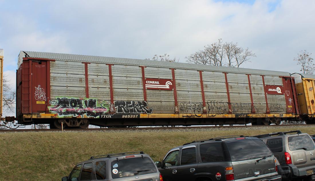 TTGX 965357 is seen in the consist of CSX Q217-16 at Newark, DE on 1/16/15. Rack number is CR 9519, built 2-93 and is now owned by CSX.