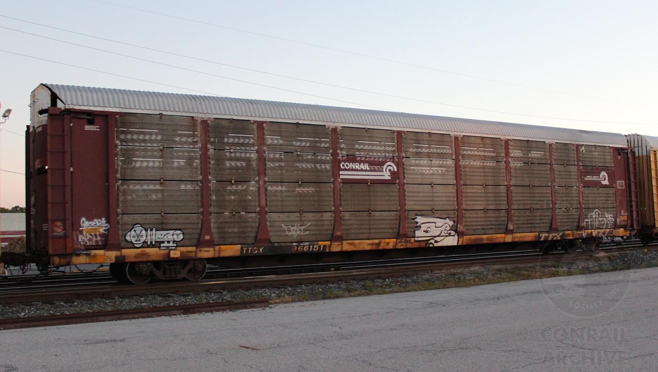 TTGX 966151 is seen in the consist of CSX Q217-23 at Elsmere, DE on 10/23/16. Rack number is CR 6775, built 10-88, rebuilt 10-96 and is now owned by CSX.
