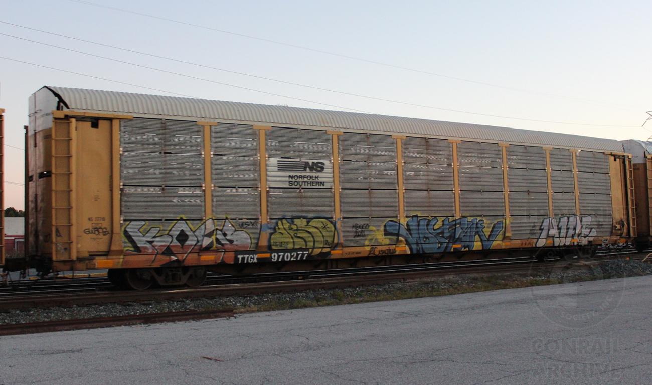 TTGX 940277 is seen in the consist of CSX Q217-23 at Elsmere, DE on 10/23/16. Rack was built as a unknown CR ML2L class rack in 3-94 and was rebuilt, repainted and renumbered to NS 27719 in 1-09. Rack is now classed FB554 by NS.