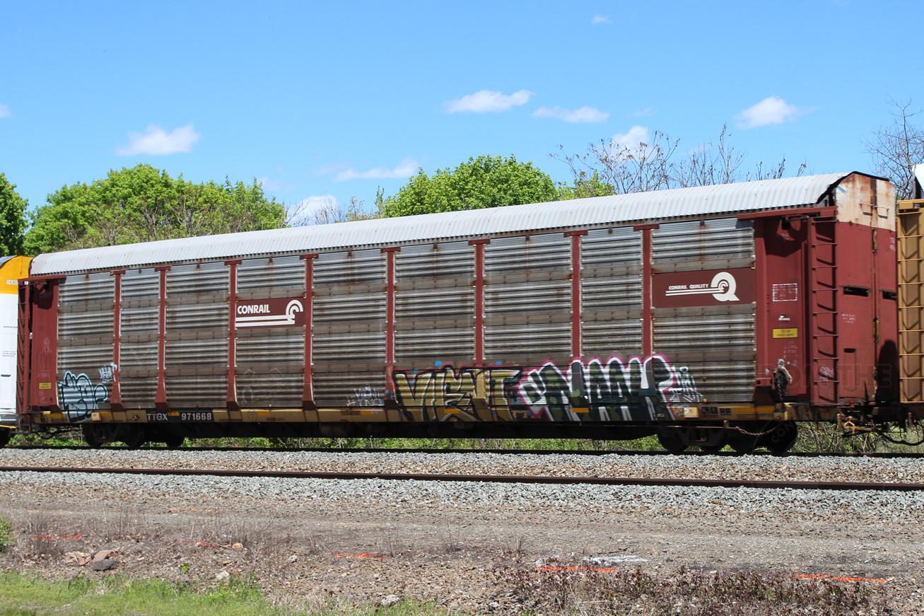 Previous Next TTGX 971668 is on a westbound at Newport, PA on 5/8/16. Rack number is CR 10123, built 3-94 and is now owned by NS. Photo By Donnie Lee Equipment Type TTGX Bi-Levels Post Conrail Owner Norfolk Southern Year 2016 Original Date 5/8/16 Collection CRHS Conrail Photo Archive Contributions