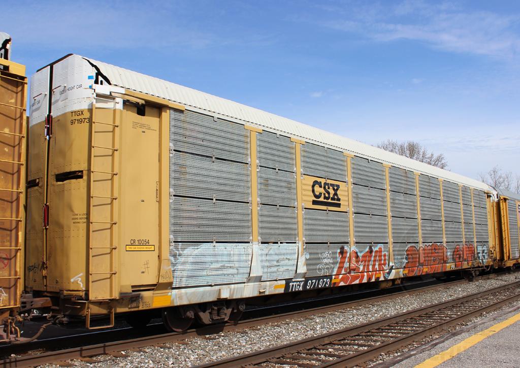 TTGX 971973 is seen on Q217-13 at Saint Denis, MD on 3/13/15. Rack number is CR 10054, built 3-94 and was rebuilt and repainted CSX in 11-07.