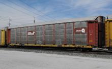 TTGX 973620 is seen in the consist of CSX L216-31 at Elsmere, DE on 4/1/14. Rack number is CR 9965, built 3-94 and is now owned by CSX.