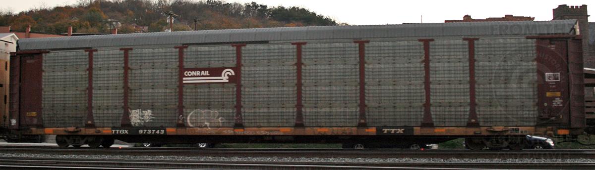 Previous Next TTGX 973743 is seen with a CR class ML2L rack. Rack was built by Thrall. Photo By Donnie Lee Equipment Type TTGX Bi-Levels Year 2011 Original Date 11/5/11 Collection CRHS Conrail Photo Archive Contributions