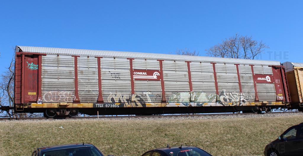 TTGX 973965 is seen in the consist of CSX Q217-23 at Newark, DE on 3/23/15. Rack number is CR 9781, built 10-93 and is ow owned by CSX.
