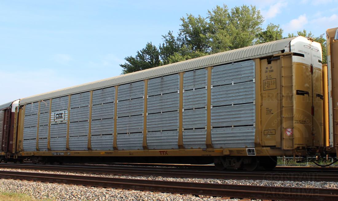 TTGX 977086 is seen in the consist of CSX Q217-05 at Point of Rocks, MD on 9/5/15. Rack number is CR 1388, built 7-86 then was rebuilt and repainted CSX in 10-14.