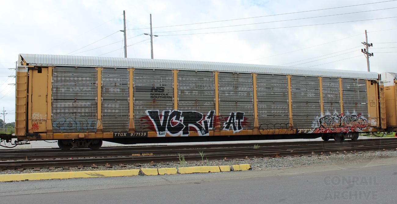 TTGX 977139 is seen in the consist of CSX Q295-10 at Elsmere, DE on 8/10/16. Rack number is CR 1345, built 7-86 and was rebuilt and repainted NS 6-03. Rack is classed FB541 by NS, but is also still stenciled ML2F.