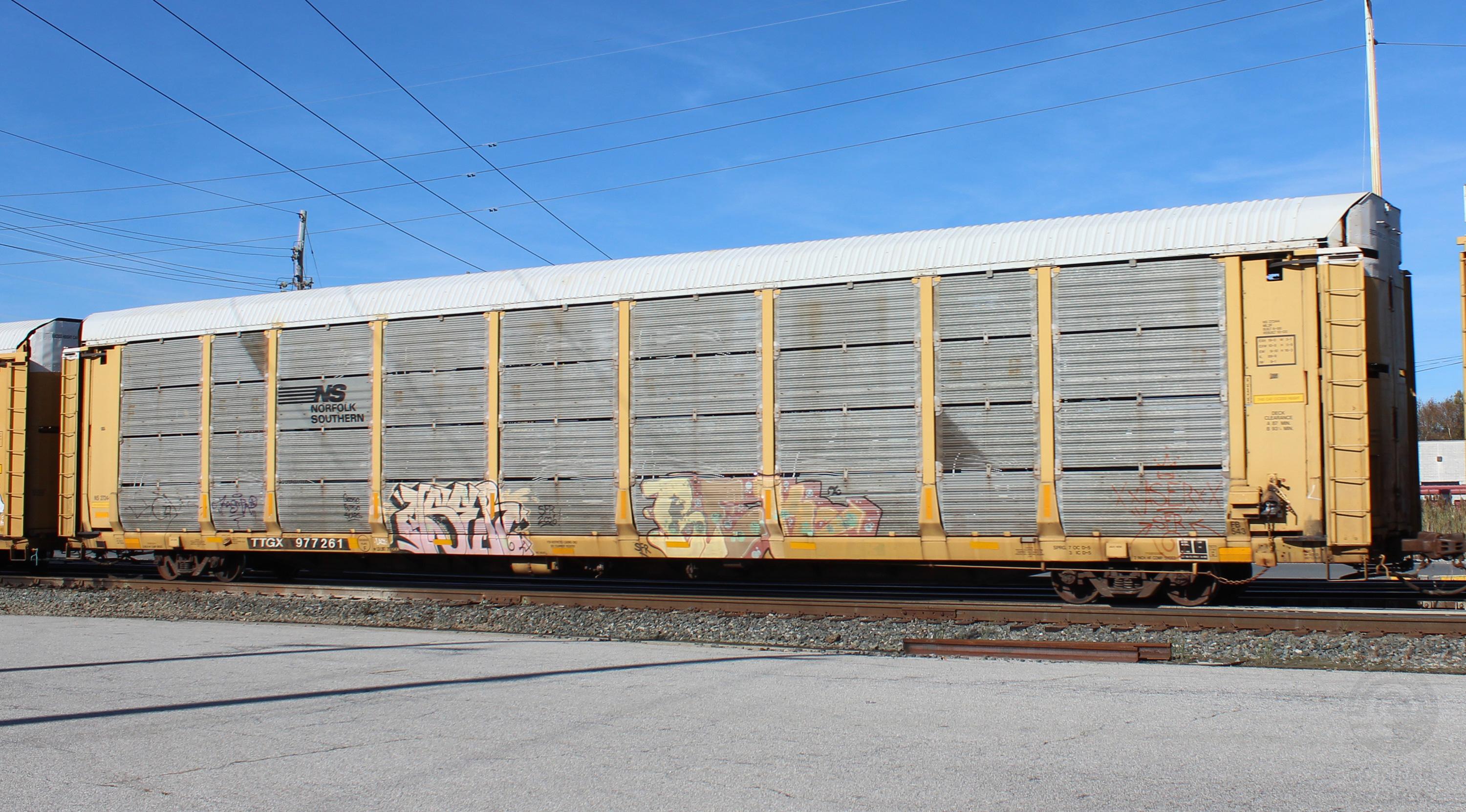 TTGX 977261 is seen in the consist of CSX Q216-08 at Elsmere, DE on 11/11/17. Rack was built as a unknown CR ML2F class rack in 6-86, then was rebuilt, repainted and renumbered to NS 27244 in 10-05. Rack is now classed FB543 by NS, but is also still stenciled ML2F.