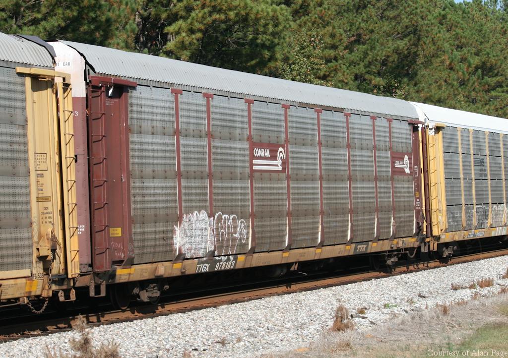 TTGX 978183 (CR ML2L rack 10752) rolls SB in a line of autoracks at Peachtree City, GA on October 30, 2016.
