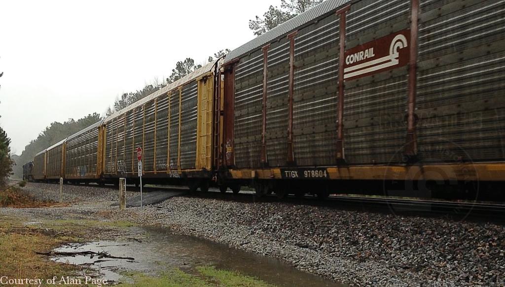 Previous Next CSX SD70AH 4567 and ES40DC 5490 pull a load of autoracks, including TTGX bi-level 978604, through pouring rain at Tyrone, GA in March 2014. Photo By Alan Page Equipment Type TTGX Bi-Levels Post Conrail Owner Norfolk Southern Year 2014 Original Date 3/17/14 Collection CRHS Conrail Photo Archive Contributions