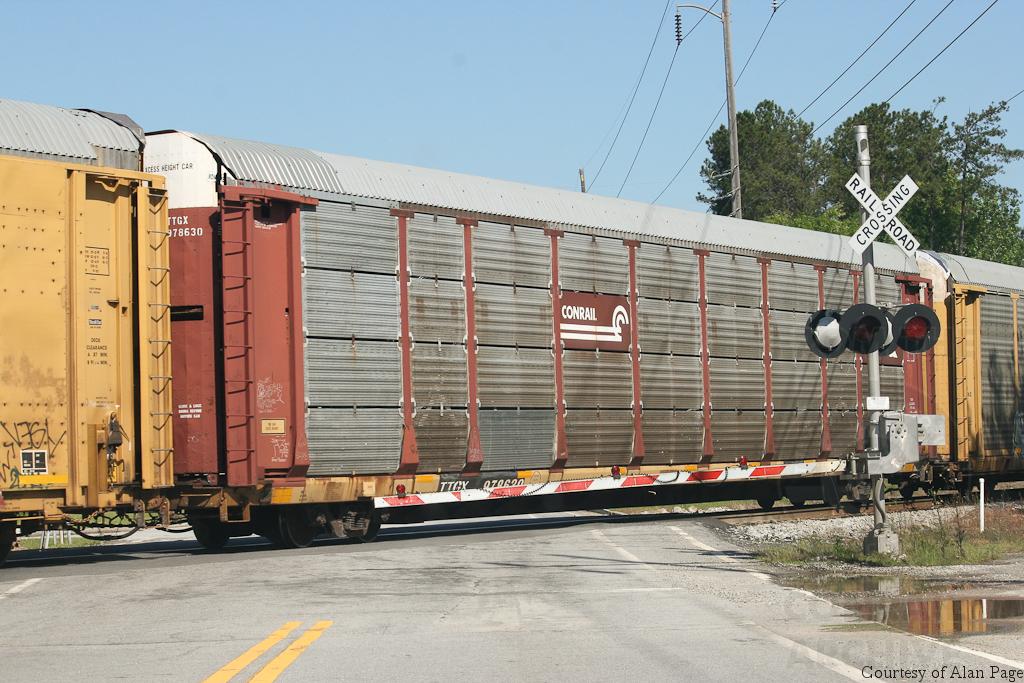 Previous Next Former CR TTGX 978630 heading southbound through the Dividend Drive gates in Peachtree City, GA on April 30, 2015. Photo By Alan Page Equipment Type TTGX Bi-Levels Year 2015 Original Date 4/30/15 Collection CRHS Conrail Photo Archive Contributions