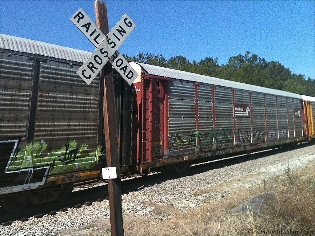 CSX SD40-2 8060, SD50-2 8666, and UP ES44AC 7413 pull a load of autoracks, including TTGX bi-level 979884, through Peachtree City, GA in March 2014.