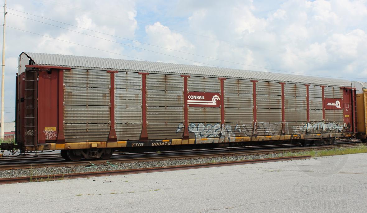 TTGX 980479 is seen in the consist of CSX Q295-30 at Elsmere, DE on 7/30/16. Rack number is CR 9571, built 3-93 and is now owned by NS.