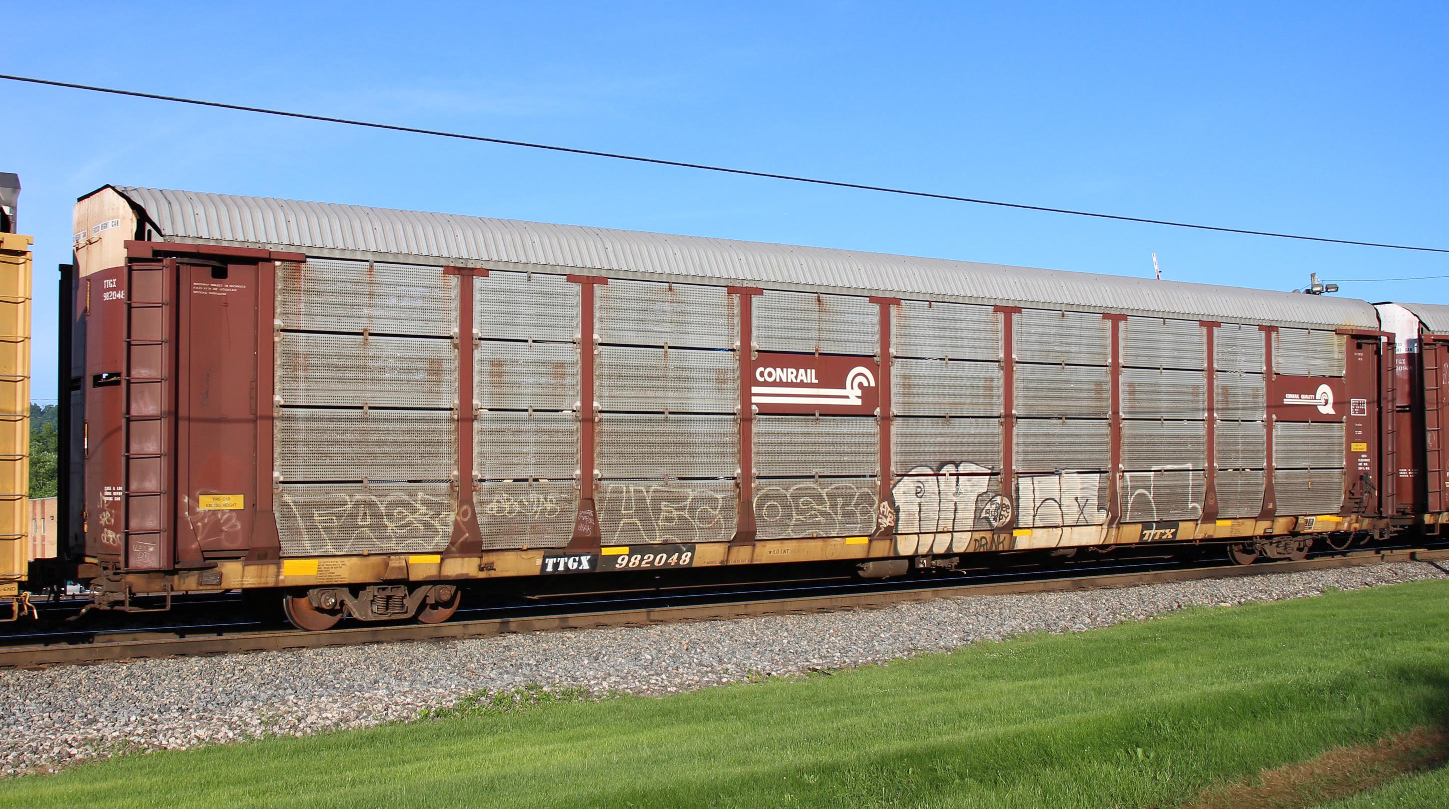TTGX 982048 is seen in the consist of CSX Q216-12 at Cumberland, MD on 6/14/18. Rack number is CR 10236, built 12-94, and is now owned by NS.