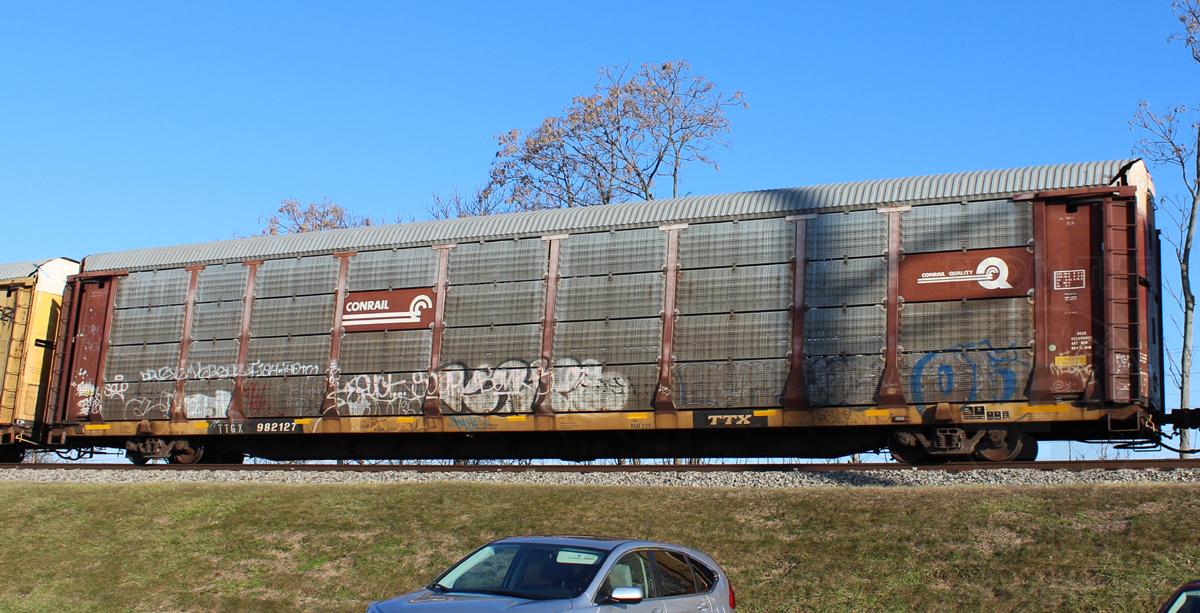 TTGX 982127 is seen in the consist of CSX Q216-26 at Newark, DE on 2/28/16. Rack number is CR 10492, built 7-95 and is now owned by NS.