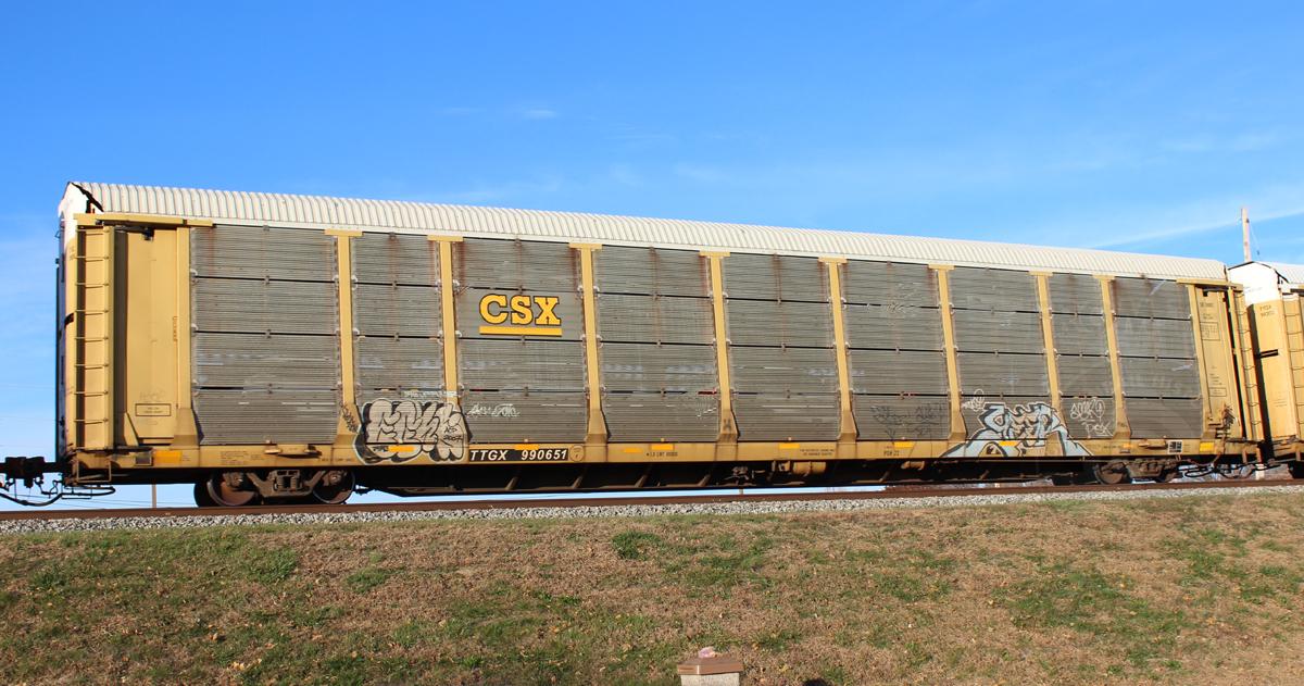 TTGX 990651 is seen in the consist of CSX Q296-20 at Newark, DE on 11/23/16. Rack number is CR 9892, built 3-94 and was rebuilt and repainted CSX 11-05.