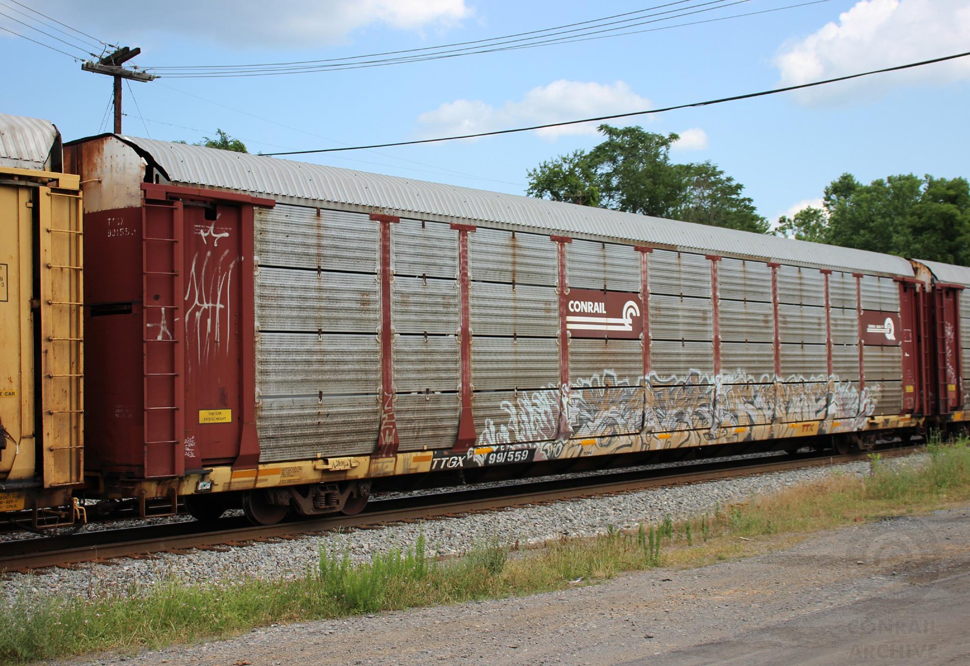 TTGX 991559 is seen in the consist of CSX Q372-08 at North Branch, MD on 7/8/20. Rack number is CR 9912, built 3-94 and is now owned by CSX. Photo by Chris Carangi.