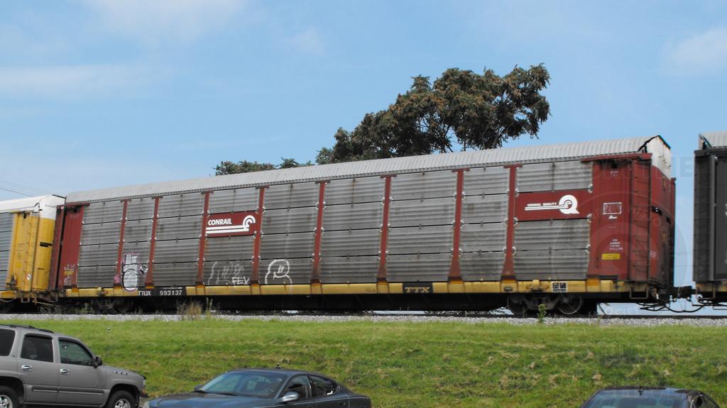 TTGX 993137 is seen in CSX Q216-29 at Newark DE on 8/31/13. Rack number is CR 9725, built 10-93 and is now owned by CSX.