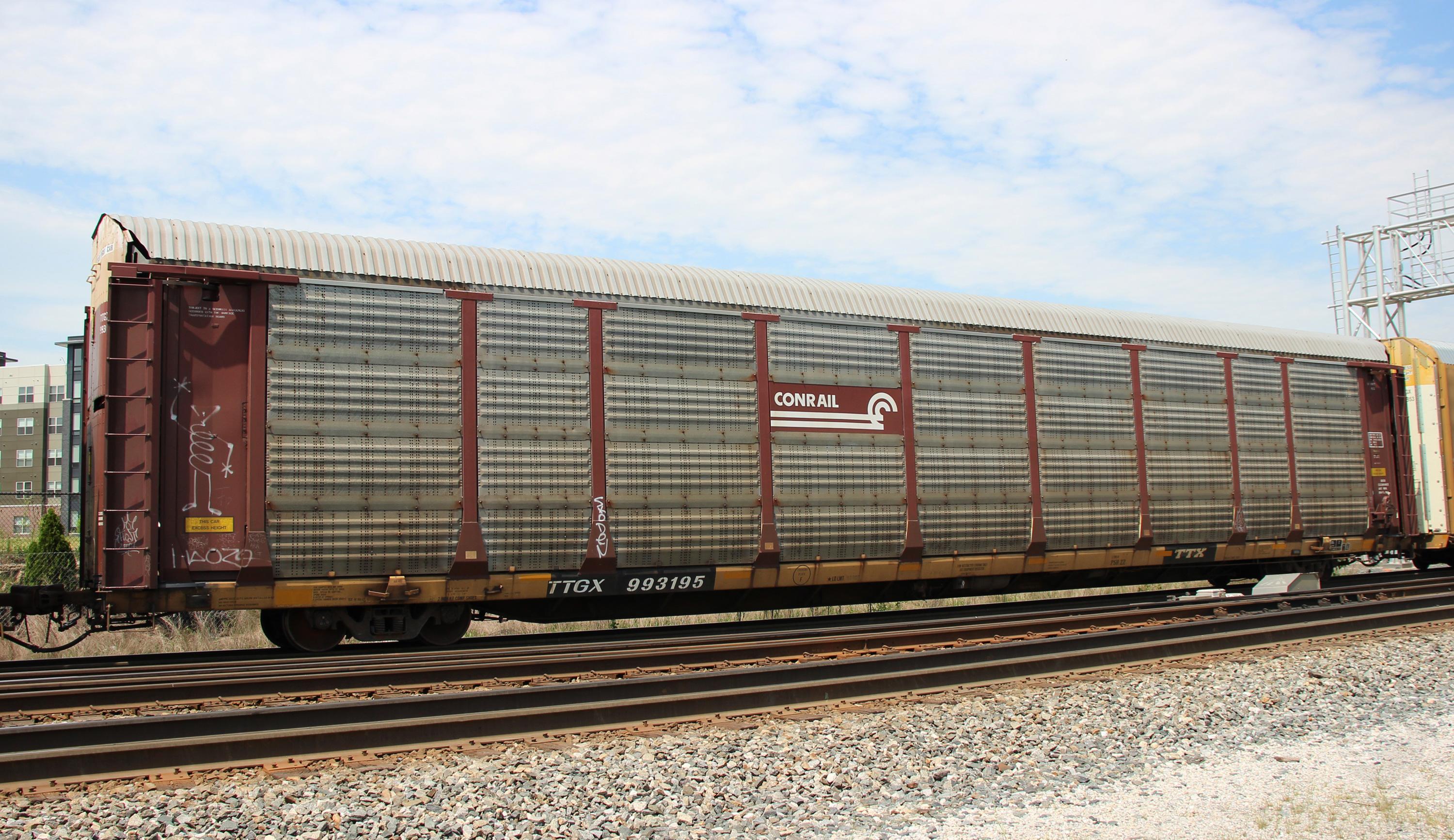 TTGX 993195 is seen in the consist of CSX Q276-10 at Savage, MD on 5/12/18. Rack number is CR 10807, built 10-97 and is now owned by CSX.