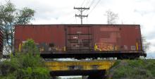 YARR 5063 is seen in the consist of CSX Q409-28 at Newark, DE on 5/2/14. Car is ex CR 369110/PC 369110 and was built 10-72 by FGE.